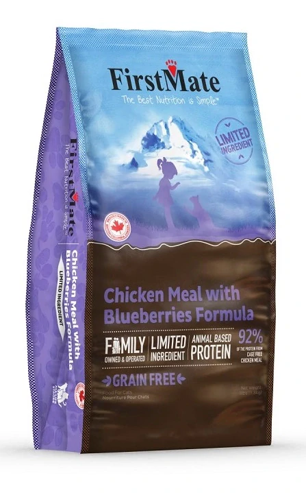 FirstMate Chicken With Blueberries Cat – Bezobilnaté krmivo pro kočky s 92% podílem živočišné bílkoviny 🐔, ideální pro kočky všech věkových kategorií a plemen. Tato kompletní ultraprémiová receptura obsahuje maso z kuřat z volných chovů 🐓, které je na prvním místě ve složení. Krmivo neobsahuje hrášek ani lepek 🚫🌾, což je skvělé pro kočky s citlivým trávením.
