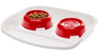 Dvě plastové misky s praktickým podnosem, objem misek 0,3 litrů. Vhodné pro kočky a malá plemena psů.
