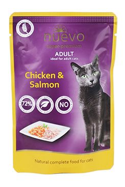 Nuevo kočka adult kuře a losos kapsička je kompletní krmivo pro dospělé kočky všech plemen, obohacené o kuřecí a lososí maso. Toto krmivo se může pyšnit svojí kvalitou, kterou reprezentuje vysoký obsah masa a přírodních suroviny, naopak neobsahuje žádné umělé přísady, obilí a lepek.