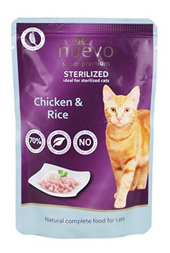 Krmivo Nuevo sterilized drůbeží s rýží je kompletní krmivo pro kastrované kočky všech plemen, obohaceno o drůbeží maso s rýží. Vysoký obsah masa a přírodních surovin, žádné umělé přísady, obiloviny či lepek dělají z tohoto krmiva opravdu vysoce kvalitní pochoutku, kterou si zamilují i ty nejvybíravější kočičky!