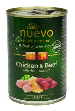 Konzerva Nuevo Kuřecí a Hovězí je vhodná pro mladé psy a štěňata, s obsahem kuřecího a hovězího masa. Vysoký obsah čerstvého masa dodává bílkoviny vysoké biologické hodnoty.Správná úroveň bílkovin, tuků, minerálů a vitamínů vytváří vyvážené komplexní krmivo, které si zamilují i největší vybíravci! Složení krmiva podporuje imunitu a pohyblivost Vašeho pejska. Nenajdete zde žádná umělá barviva, příchutě či konzervační látky.