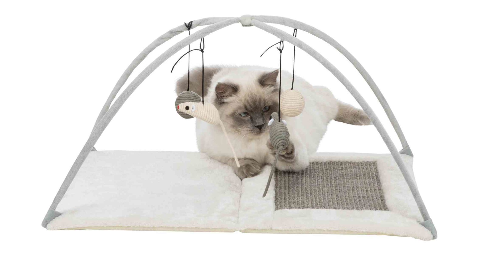 Hřiště, škrábací podložka s hračkou na pružině – 60 x 33 x 42 cm, šedá 🐾🏰