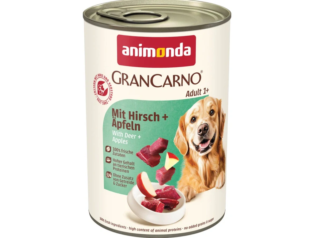ANIMONDA GRAN CARNO Adult - S jelením masem a jablky je optimálně vyvážené a chutné krmivo pro dospělé psy ve věku 1–6 let. Toto krmivo je vyrobeno z čerstvého masa a vnitřností, obsahuje viditelné masové kousky, což zaručuje výbornou chuť a nefalšovaný požitek při každém soustu. 🍖🍏