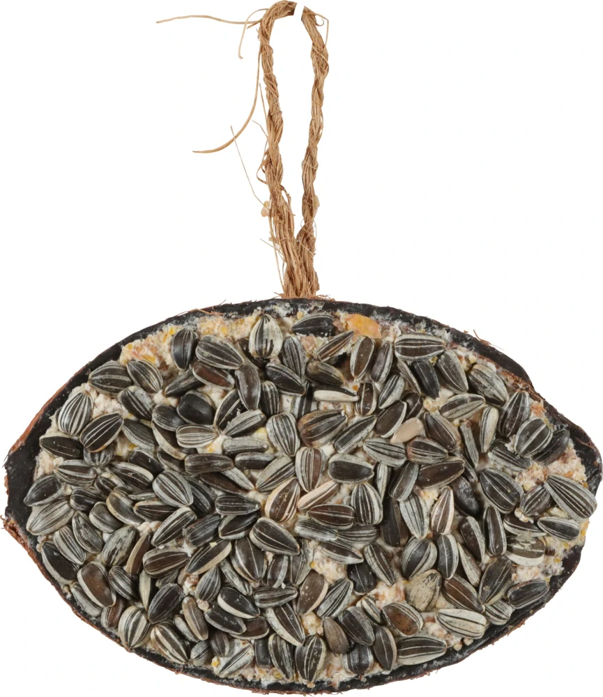 Tento kokosový košík je naplněný voňavým lojem a slunečnicovými semínky – připravený k zavěšení přímo na strom nebo balkon! 🌿