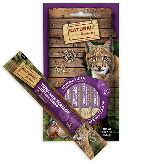 Natural Greatness Creamy DHA BRAIN – krémový pamlsek pro kočky s tuňákem a hřebenatkou, 4 × 14 g 🐟🐚🧠 / Veselý zvěřinec /