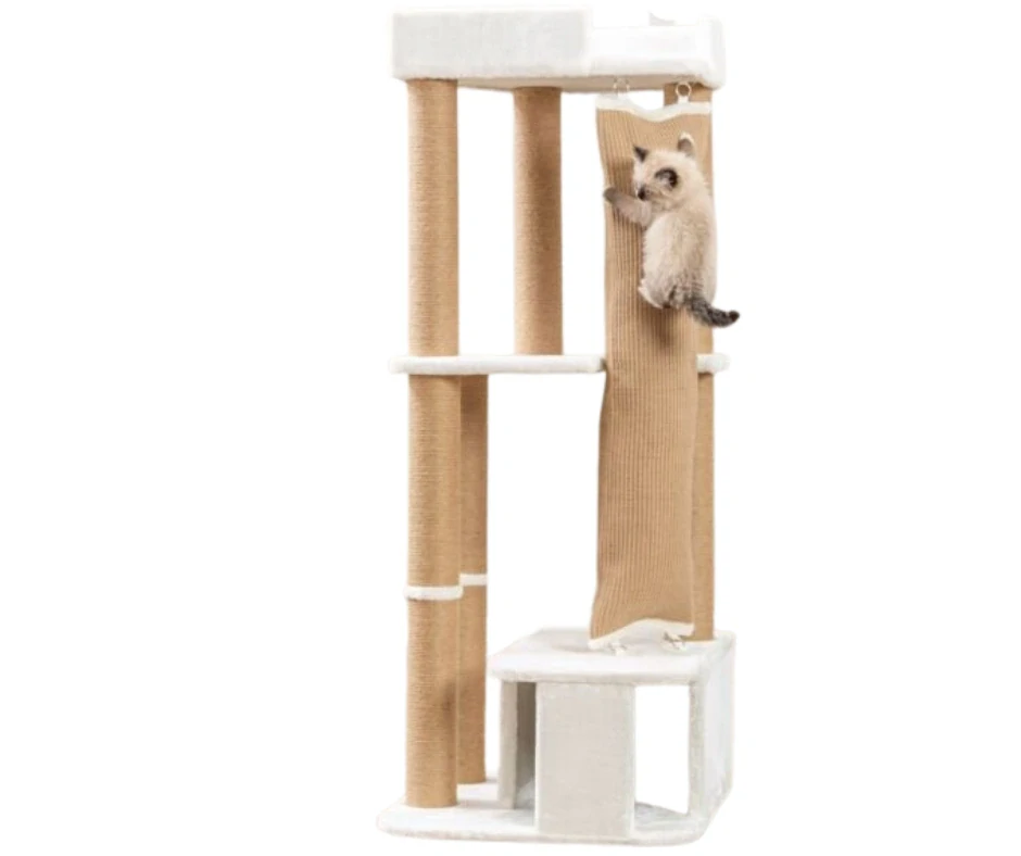 Tohle není jen obyčejné škrabadlo. Je to kočičí hřiště, kde se dá šplhat nahoru, skrýt se do jeskyňky, rozvalit se v měkkém pelíšku a mít přehled o celém království 👑🐱