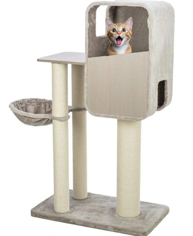 Tohle moderní škrabadlo v šedém provedení spojuje styl, pohodlí i stabilitu. Má jeskyni se dvěma vstupy, měkkou hamaku i prostornou podestu – ideální pro pozorování celého „království“.